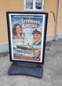 Langtved Teaterforening på Fyn – ikke langt fra Kerteminde – opfører i disse dage en helt ny teaterversion af den gamle Saga Studio succes “Styrmand Karlsen” (1958). Der er altså ikke tale om det oprindelige teaterstykke “Styrmand Karlsens flammer” af Flemming Lynge og Axel Frische, som filmen var baseret meget frit på, men et helt nyt stykke bygget på handlingen og de vittige replikker fra filmen, hvis manuskript i sin tid blev skrevet af blandt andet Saga Studio-ejeren John Olsen selv. På forunderlig vis er det lykkedes en af de lokale ildsjæle Gunhild Helmer Pedersen at få brudt historien ned i sekvenser, som kan fremføres på teaterscenen. Svinkeærinderne i filmen, hvor sømændene går i land undervejs til den lysegrønne ø og de i vore dage måske lidt problematiske sekvenser, der i filmen havde Karl Stegger som sort justitsminister med skosværte i ansigtet er udeladt, men ellers er stort set det hele kommet med. Også den dramatiske brand ombord, hvor den unge skibsredersøn viser sig at være af den rette støbning, da det virkelig gælder.